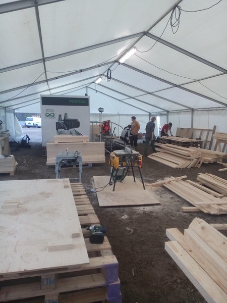 Am Morgen wurden wir unsanft geweckt und gebeten das Tipy zu verlassen. Wir luden die Zelte aus und bauten drei Spatzen und ein Materialzelt auf. Als wir fertig damit waren gingen wir weiter zum Baumhaus, legten dessen Grundriss fest und montierten die Rollen, damit wir später Personen und Baumstämme daran hochziehen können.