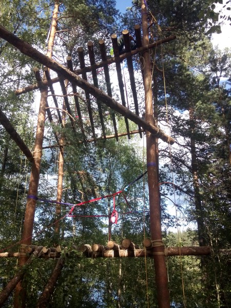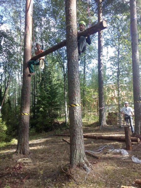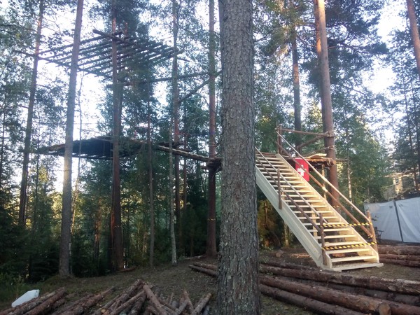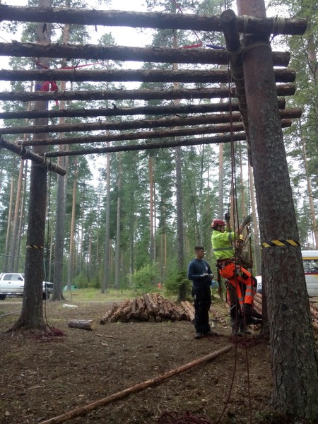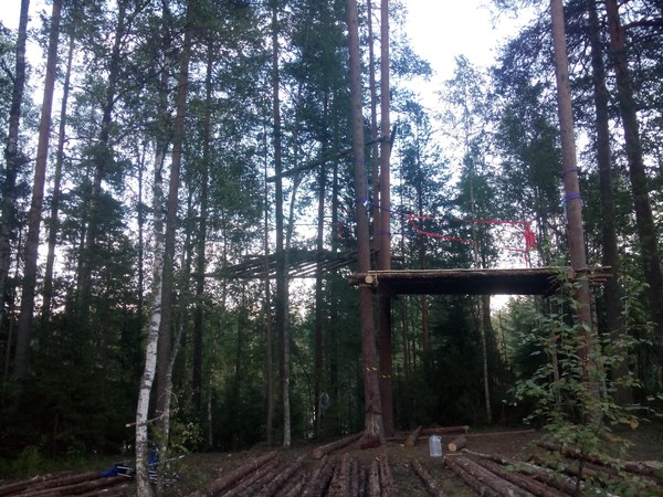 Nach dem Aufstehen machten wir uns an das Werk und rosteten die erste und bald auch die zweite Plattform. Gegen Abend verlegten wir auch die Bretter auf der ersten Plattform und fixierten die Trägerstämme des Zwischenpodests zur dritten Plattform.