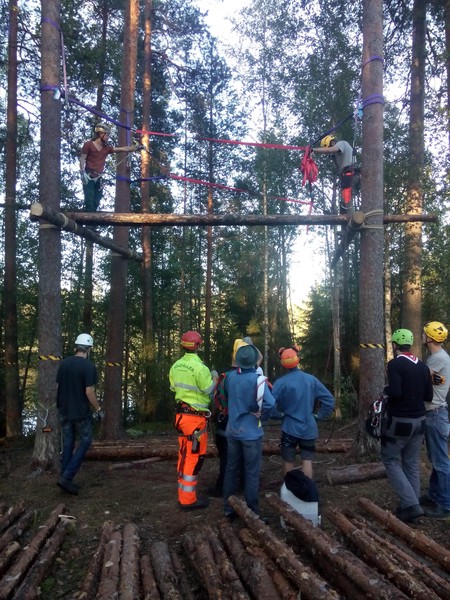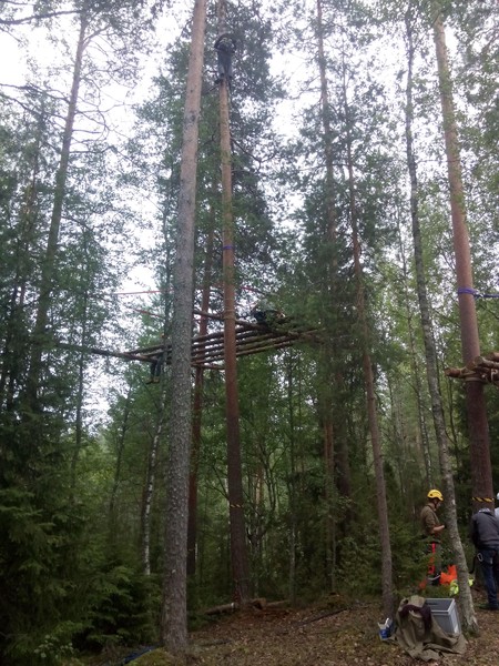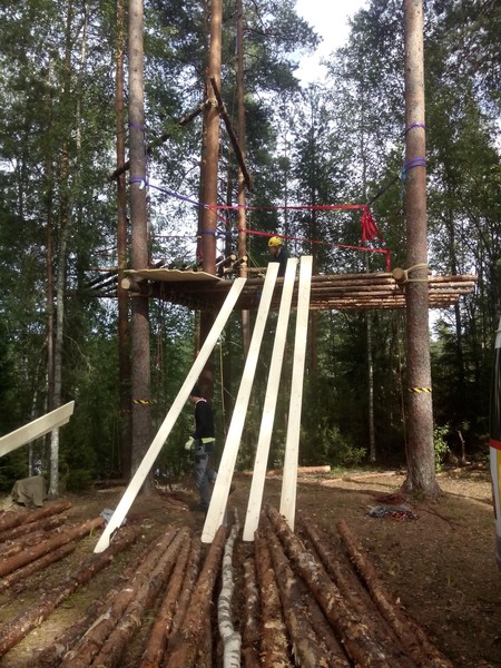 Am Abend hatten wir die Tragstämme der ersten Plattform komplett montiert, das Sicherungsspannset gespannt und mit dem Auslegen der Baumstämme (rosten) begonnen. Die zweite (höhere) Plattform war mit zwei Tragstämmen begonnen.
