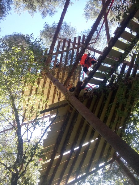 Es folgte die Absicherung der ersten Plattform mit einem Geländer und die Montage der Treppe auf die erste Plattform. Auch der Bau der dritten Plattform kam gut voran und neben den Trägerstämmen konnten auch alle Baumstämme für das Rosten hochgezogen, verteilt und fixiert werden. Gegen Abend wurde der Grundstein für die Brücke von der ersten zur zweiten Plattform gelegt.